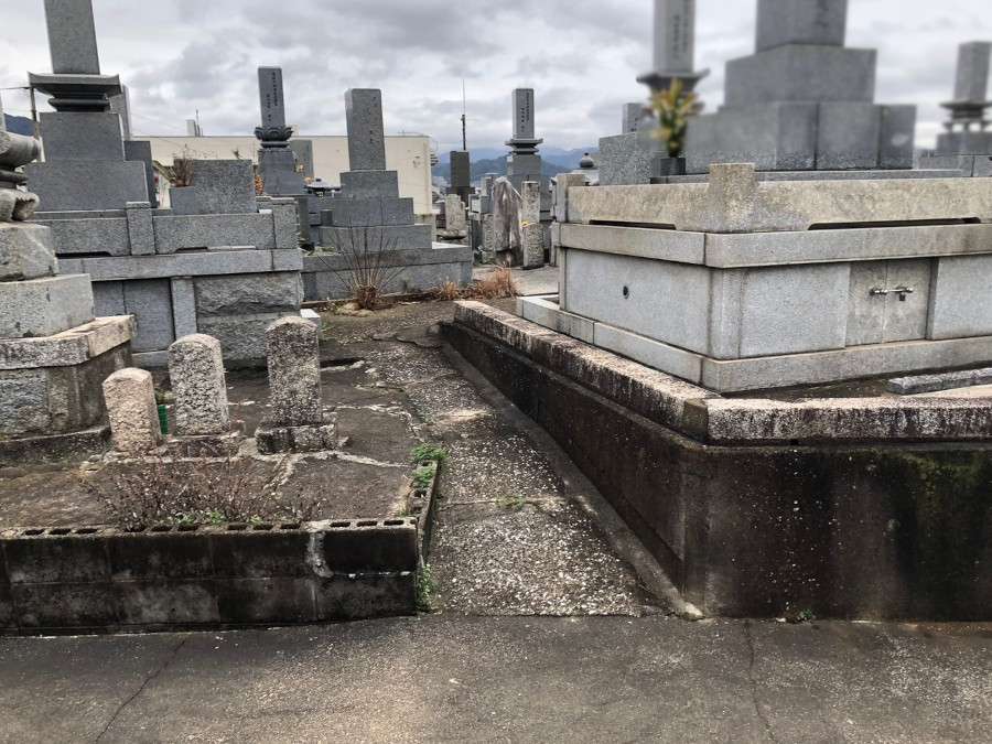 お墓の後方には小さな古いお墓がたくさん建てれていました。お客様とご一緒に現地を確認し、お隣のお墓がご親戚様のお墓ということで、後方のお墓はそのままにしておくことになりました。