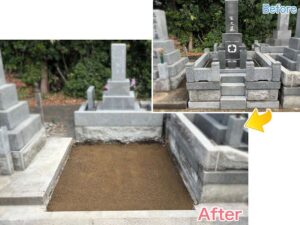 植物で覆われていたお墓がとてもすっきりして、明るく風通しも良くなりました。これなら、遠方からお客様がお参りにお越しになっても、お手入れが簡単で気持ちよくお参りいただけそうです^^