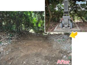 左側の大きなお墓と、右手の小ぶりなお墓、どちらもお墓じまいをご希望でした。ご遺骨は、近くにある菩提寺様の納骨堂へ移され、永代供養されるということでした。とてもきれいにされていて、これまで大切に守ってこられたのが分かります。