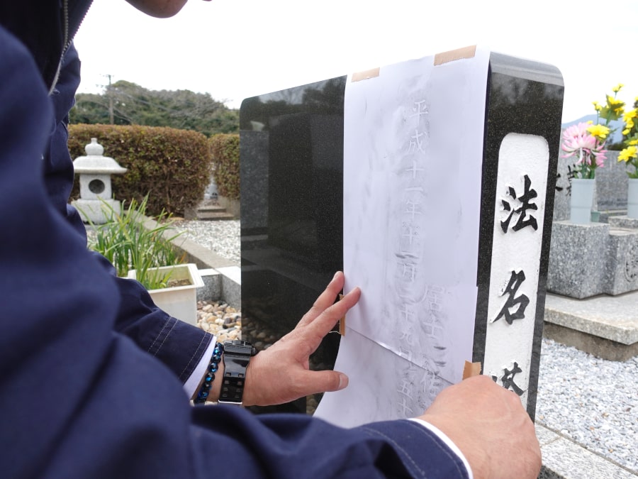 彫刻するお墓へ行って、現地で確認をいたします。既に彫刻されているご戒名(法名)やお名前がある場合は、その書体や大きさに揃えるため、拓本(トレース)を行います。